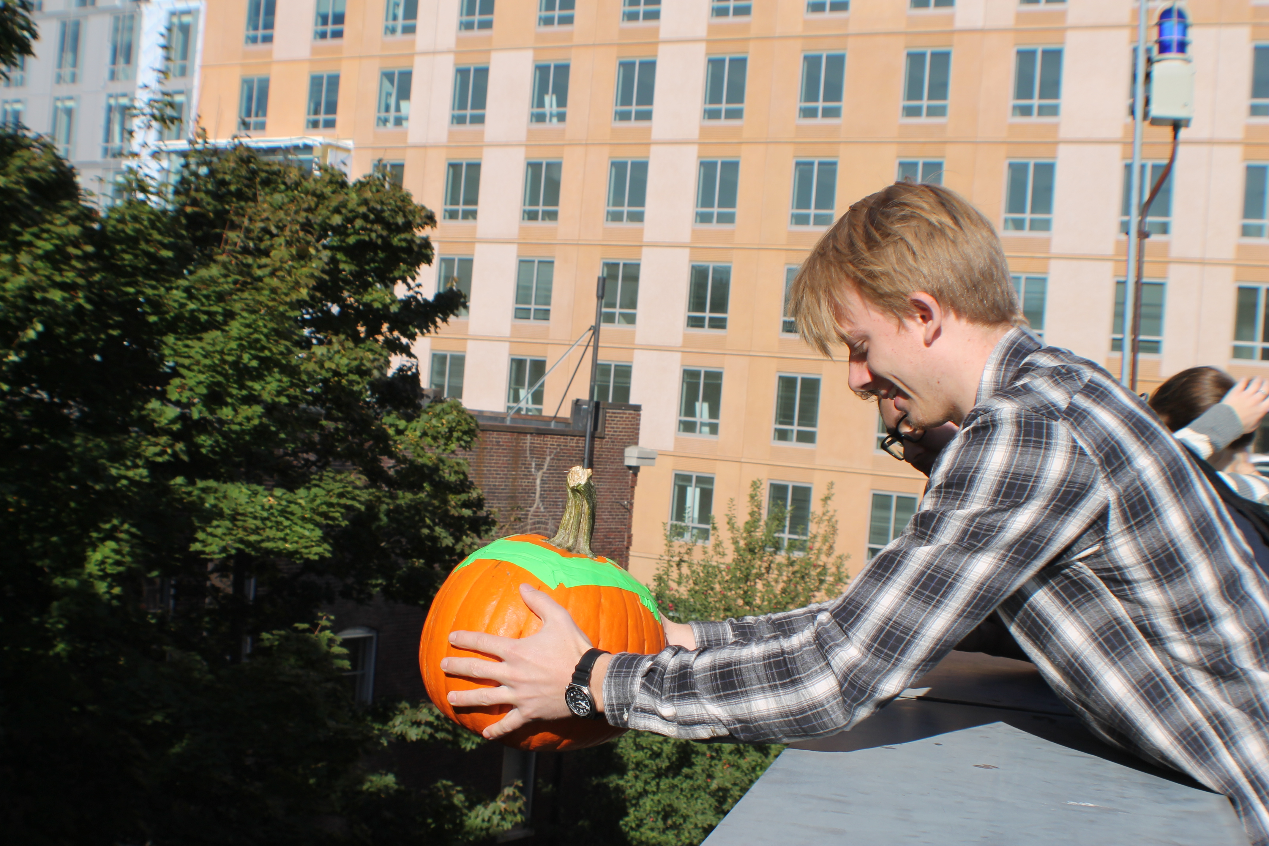 First Year Engineering students test their engineering skills at 2014 pumpkin drop. The students were challenged to put an egg in a pumpkin and drop it from the top of the Gainesborough garage. The goal was to keep their egg intact- the results were exciting.