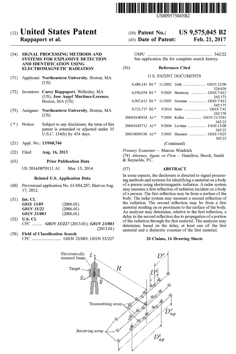 ALERT members Carey Rappaport & Jose Martinez-Lorenzo awarded a patent for "Signal processing methods & systems for explosive detection & identification using electromagnetic radiation".