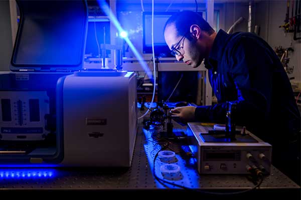 ECE Professor Srinivas Tadigadapa and Soheil Farazi, PhD’24, electrical engineering, are using quantum mechanical techniques to develop optical microchips that will revolutionize infrared spectroscopy by reducing the need for bulky and costly palmtop machinery, making the process more accessible.