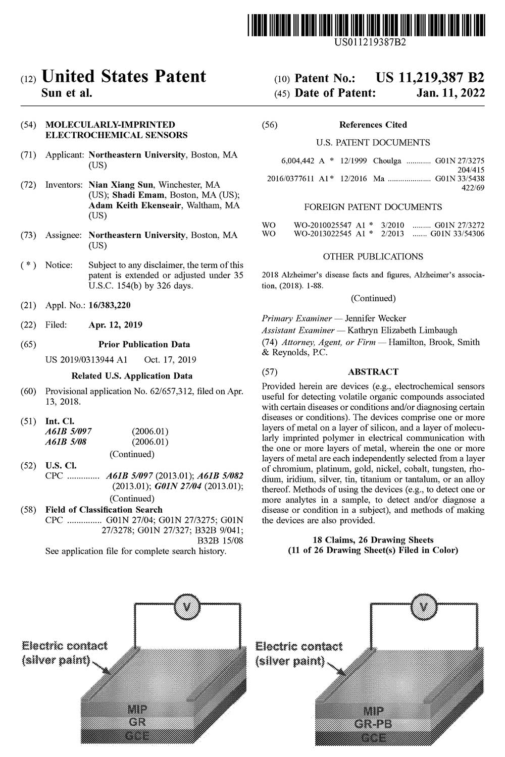 ECE Professor Nian X. Sun and ChE Associate Teaching Professor Adam Ekenseair were awarded a patent for “Molecularly-imprinted electrochemical sensors.”