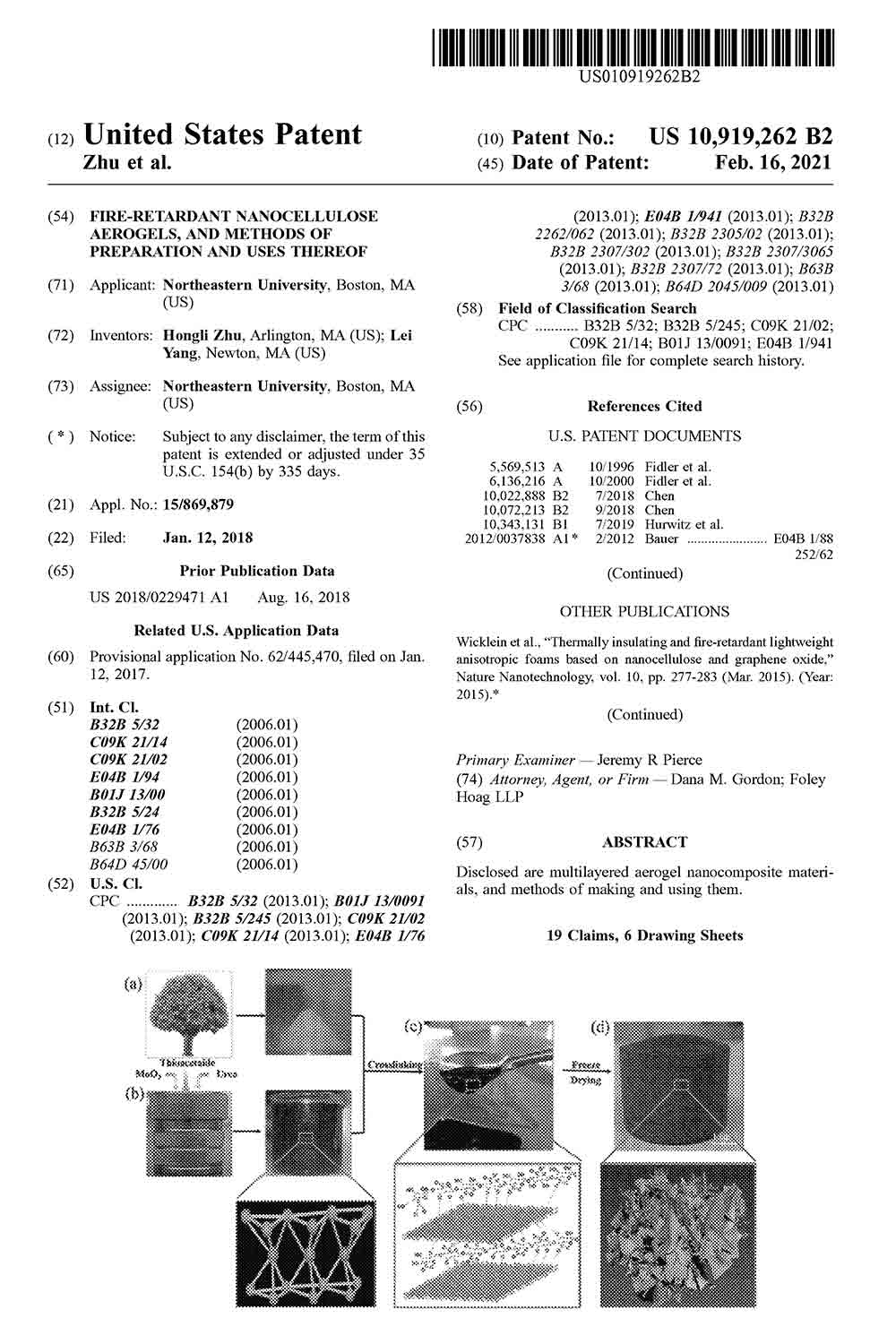 MIE Assistant Professor Hongli “Julie” Zhu was awarded a patent for “Fire-retardant nanocellulose aerogels, and methods of preparation and uses thereof”.
