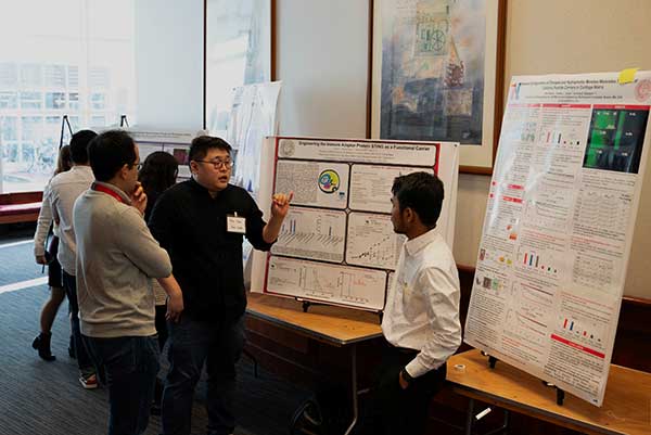 - Bioengineering PhD students converse as they present their projects.