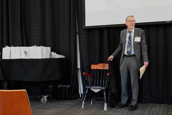 - Makowski receives a chair with his name and title on it to thank him for his time as chair of the department.