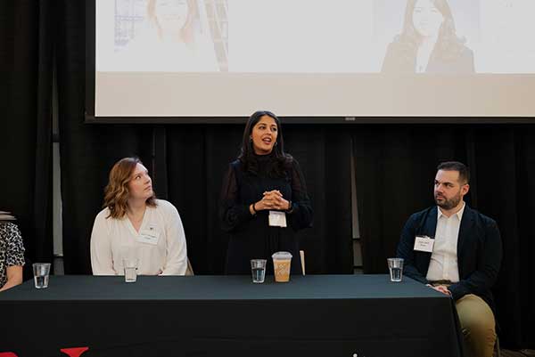 - Singh answers a current bioengineering student’s question as part of the alumni panel.