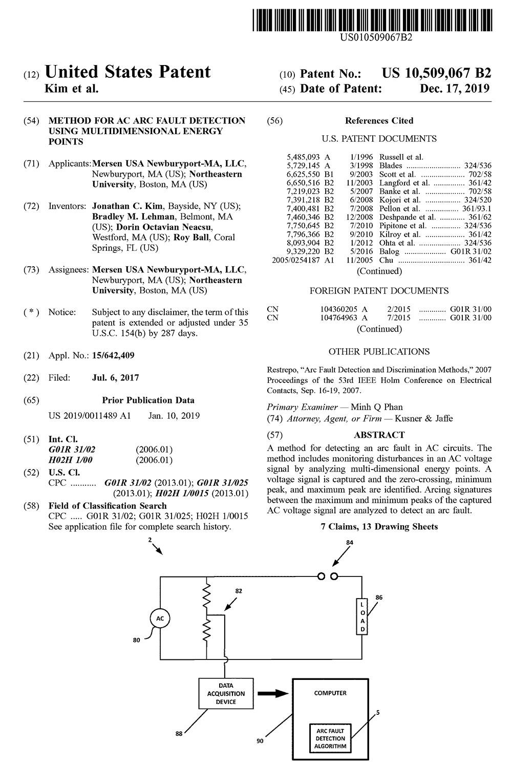 ECE Professor Bradley Lehman awarded patent for creating a “Method for AC arc fault detection using multidimensional energy points”.