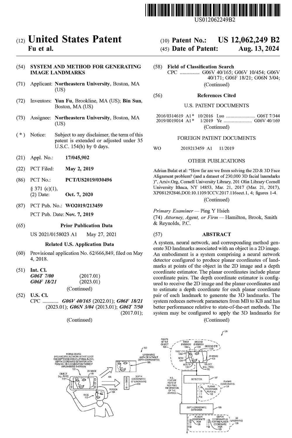 ECE/Khoury Professor Yun Raymond Fu was awarded a patent for “System and method for generating image landmarks.”