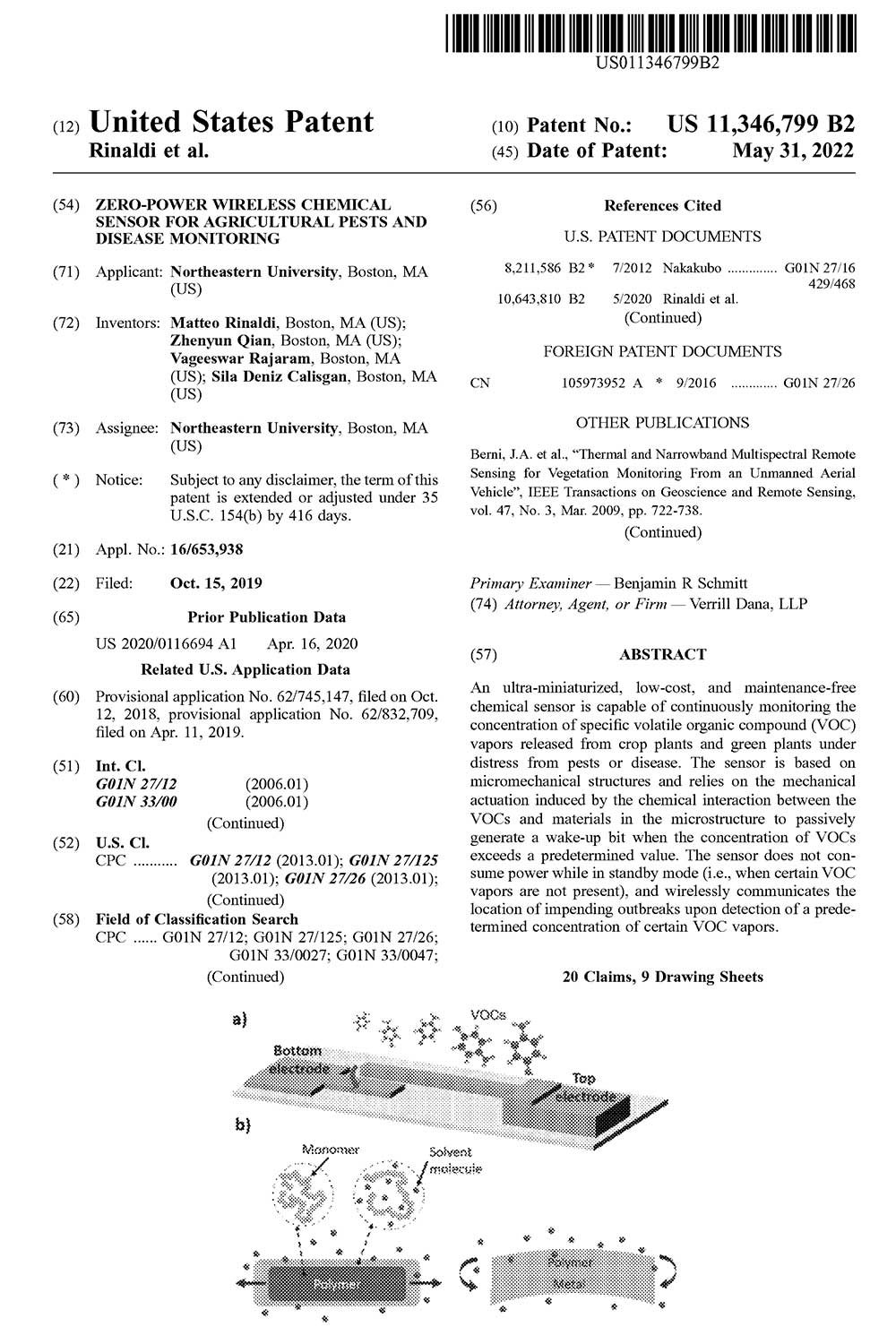 ECE Professor Matteo Rinaldi and Research Assistant Professor Zhenyun Qian were awarded a patent for “Zero-power wireless chemical sensor for agricultural pests and disease monitoring.”