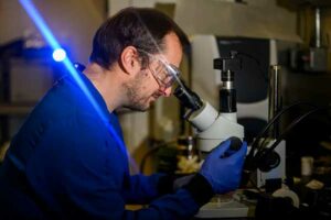 Aron Stubbins, professor of marine and environmental sciences, inspects microplastics from the open ocean in the Mugar Life Sciences Building. He co-authored a study showing they slow the descent at which carbon-removing “marine snow” descends to the deep ocean. Photo by Matthew Modoono/Northeastern University