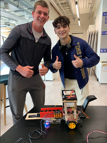 First-year engineering students at Northeastern University London showed off their hard work this semester with a robot exhibition in the campus hub. In the fall, they built simpler robots to gain skills and prepare them for more complex projects. In the spring, their projects are done in teams of three, where the team selects a problem they are interested in, formulates a problem statement, and works together to design and build a prototype solution using the skills gained, and researching where needed on their specific design needs. They use the maker space designed and set up in London, including 3D printers, and a myriad of tools and materials. They use the graphics and programming learned to design parts, build devices, and program robots to function. They worked very hard over the semester to complete these projects so that there were working robots (on a prototype scale) for every team, we are extremely proud of the results.