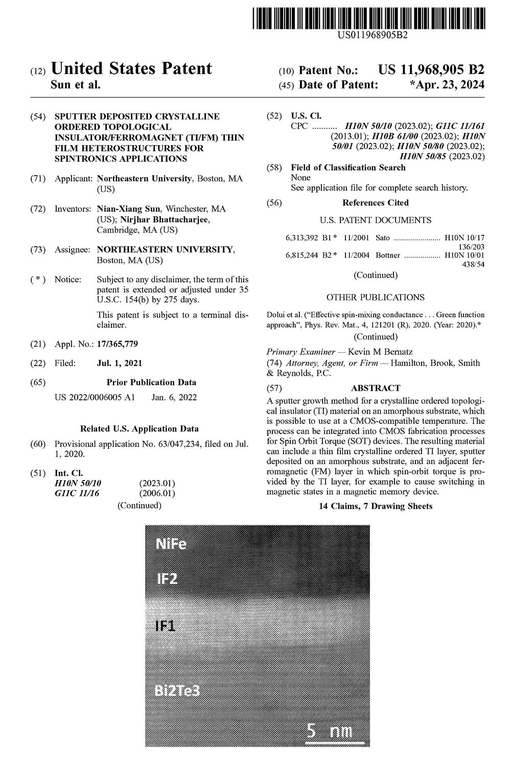 ECE Distinguished Professor Nian Sun was awarded a patent for “Sputter deposited crystalline ordered topological insulator/ferromagnet (TI/FM) thin film heterostructures for spintronics applications.”
