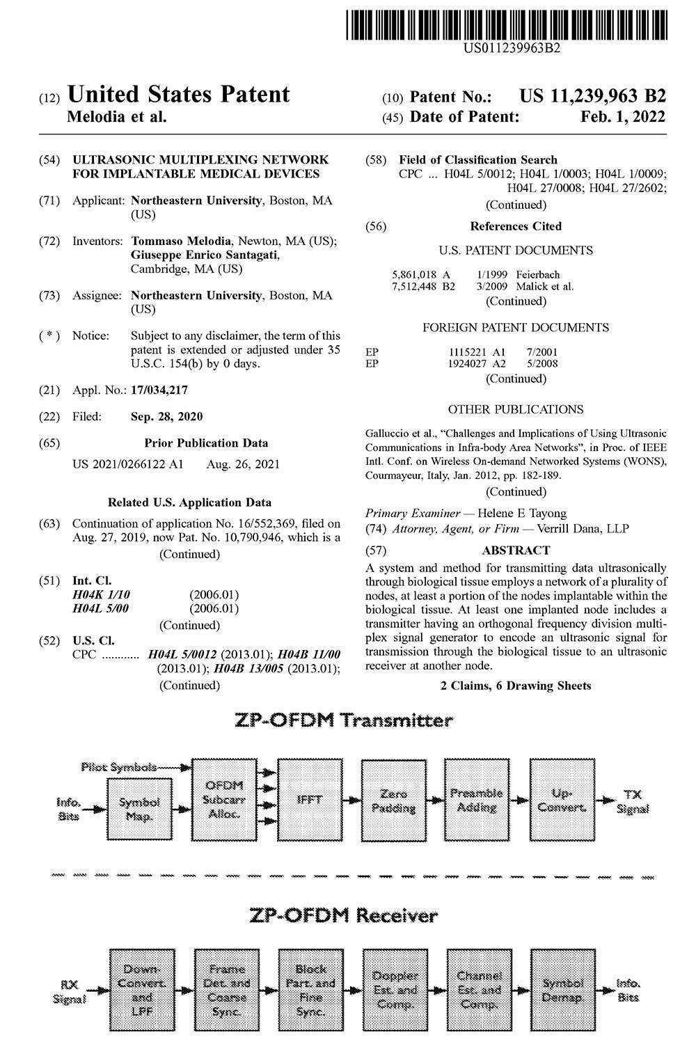 ECE William Lincoln Smith Professor Tommaso Melodia was awarded a patent for designing an “Ultrasonic multiplexing network for implantable medical devices.”