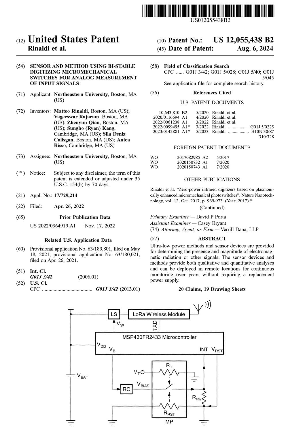 ECE Professor Matteo Rinaldi and Associate Research Professor Zhenyun Qian were awarded a patent for “Sensor and method using bi-stable digitizing micromechanical switches for analog measurement of input signals.”