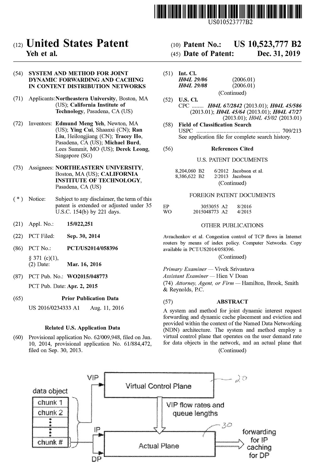 ECE Professor Edmund Yeh was awarded a patent for creating a “system and method for joint dynamic forwarding and caching in content distribution networks.