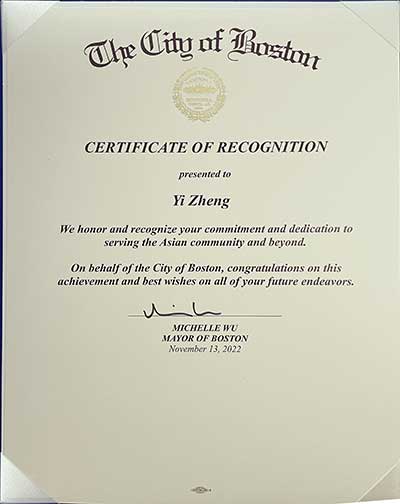 Zheng Receives Certificate of Recognition From Boston Mayor